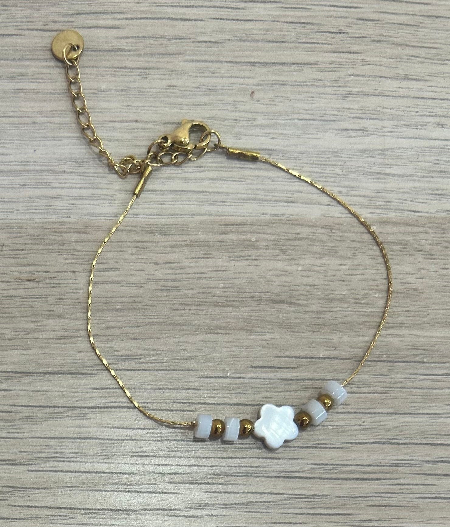 acier inoxydable doré, fleur et perles de nacre. Fermoir chaînette