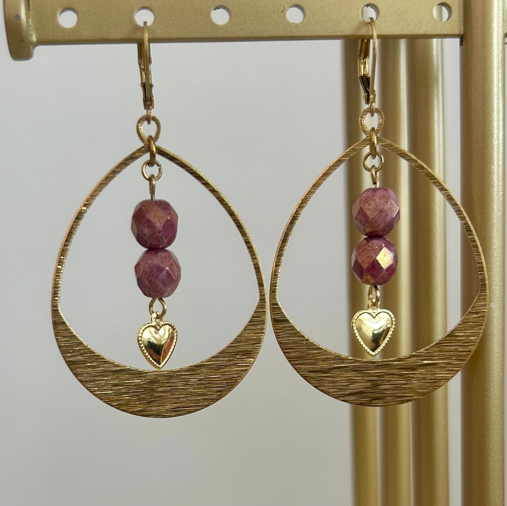 Boucles d'oreilles perles rose à facettes pendentif coeur, fermoir dormeuse