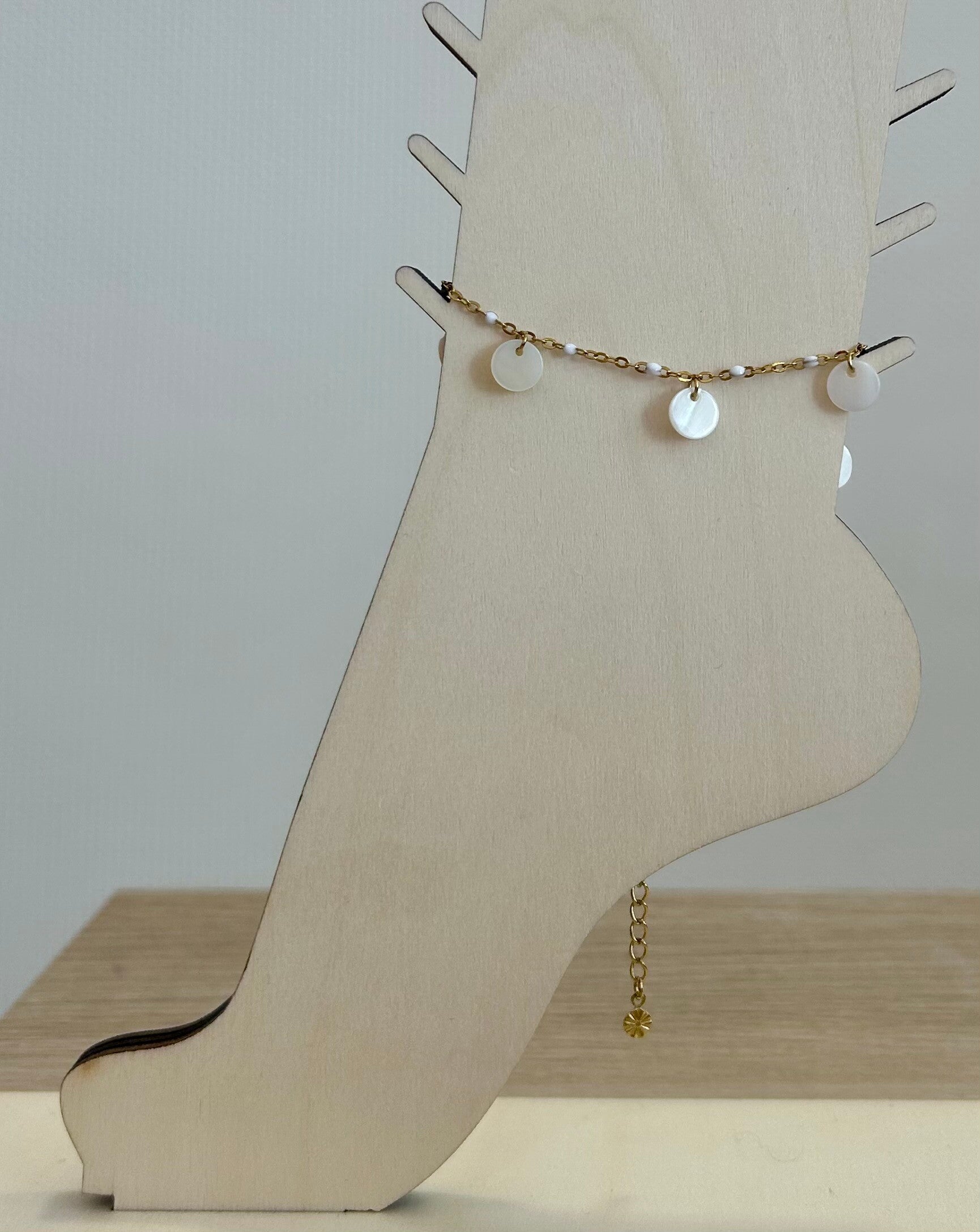 Acier inoxydable doré, pampilles nacre blanc. Chainette de réglage